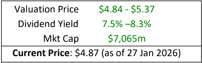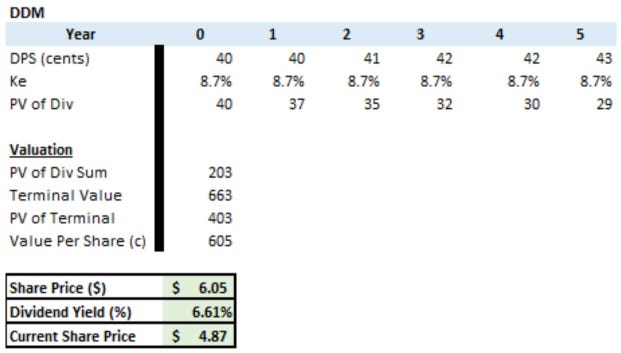 When adjusting the growth rates by 100 basis points from zero, we can see how the price and yield changes. Realistically a 1% increase in the dividend is reasonable, therefore a reasonable maximum share price is $5.37 (which was a previous peak in August 2025). Over the last 3-4 years, the dividend per share has been flat with no growth rate.