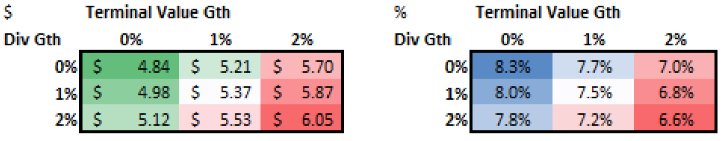 Using the baseline assumption of zero increases in dividend growth and terminal value, the stock appears fairly valued at $4.84 (current is $4.87). This also offer a yield of 8.3%.