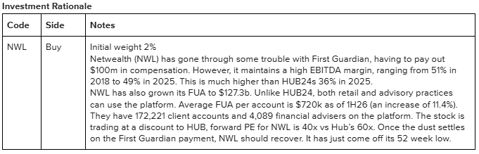The Portfolio is predominantly Technology at the moment. As a result the drawdown in tech today will be keenly felt. Pleasingly though the drawdown today did not appear to be as deep as the rally from yesterday. This should help the portfolio value in the longer term. The positive performers in the portfolio today were WDS, and OBM again, with a surprise +1.6% gain in Shape (SHA). The portfolio didn’t trade much today. An initiation on Netwealth (NWL) was the only execution because the Financial allocation to the portfolio is too low compared to the benchmark.
