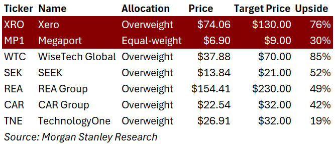 Below are the technology companies Morgan Stanley mentioned. Two of which (in red) are in the portfolio. Just between us, there is a limit order on WiseTech waiting to be executed. It has not dropped to the target entry price yet, hence it is not in the portfolio.