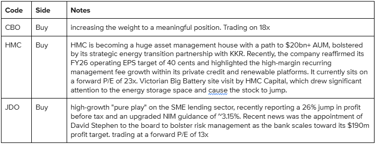 High-growth and tech names dominated the session, led by a massive 16.2% surge from HMC Capital, while Zip and Life360 followed with strong double-digit and mid-single-digit gains. Conversely, defensive and large-cap stocks stagnated, with Cobram Estate Olives (CBO) finishing as the day's sole decliner at -0.3%. Took the opportunity to buy more of the stock. Woodside and Coles remained flat despite broader market momentum.