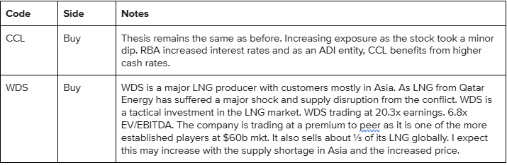It was another tough session, ASX following the US down. Oil price went higher from Middle East tensions making energy the best sector of the day. Oil is not the only commodity under pressure. LNG issues are also expected to be a future problem should the tensions not cease. A position in WDS was initiated to gain exposure to both the LNG market. Gold miners fell due to the drop in gold price.