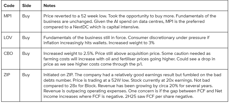 Two thirds of the portfolio fell. A mixture of tech, materials, and consumer. MP1 gave back the gains it had generated for the portfolio. It had a middle weight so the opportunity was taken to increase it to 7% of the portfolio. WDS gained with the rest of the energy sector. It is only a 2% weight as the sector is heavily geopolitical driven. Opportunistic buying in performing names was taken.