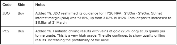 CCL announced the completion of their acquisition of Paymark. The French Works Council has signed off on the deal. Worldline (Paymark parent) has exercised the put options (selling the shares to Cuscal). The acquisition is expected to complete on 29 May 2026. JDO reaffirmed its guidance for FY26 NPAT $180m - $190m. We added 1% to the portfolio.